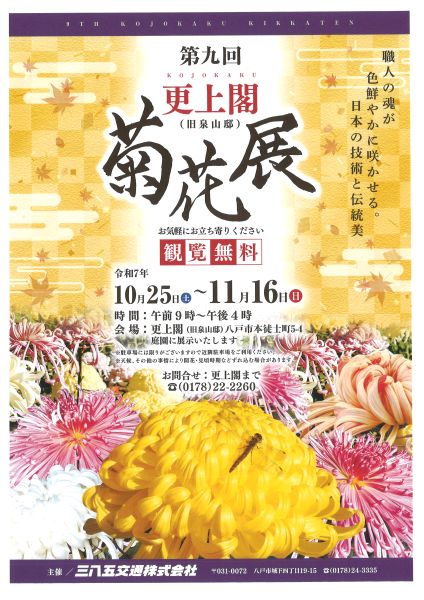 開 催:令和7年10月25日(土)~11月16日(日) 時 間:9:00~16:00会 場:八戸市更上閣(旧泉山邸・国登録有形文化財)入場 料 : 無料※駐車場は台数に限りがありますので、近隣の民間駐車場または 公共交通機関でのご来場をお願いいたします